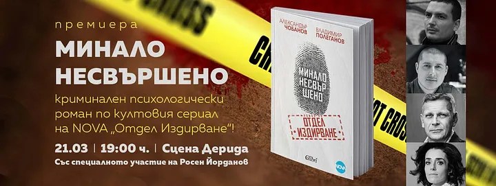 На 21-ви март от 19:00 ч. на сцена ДЕРИДА (Derida Dance Center) ще се състои премиерата на „Минало несвършено“ — криминален психологически роман по известния сериал на NOVA „Отдел „Издирване“. Издател на книгата е “Колибри”.